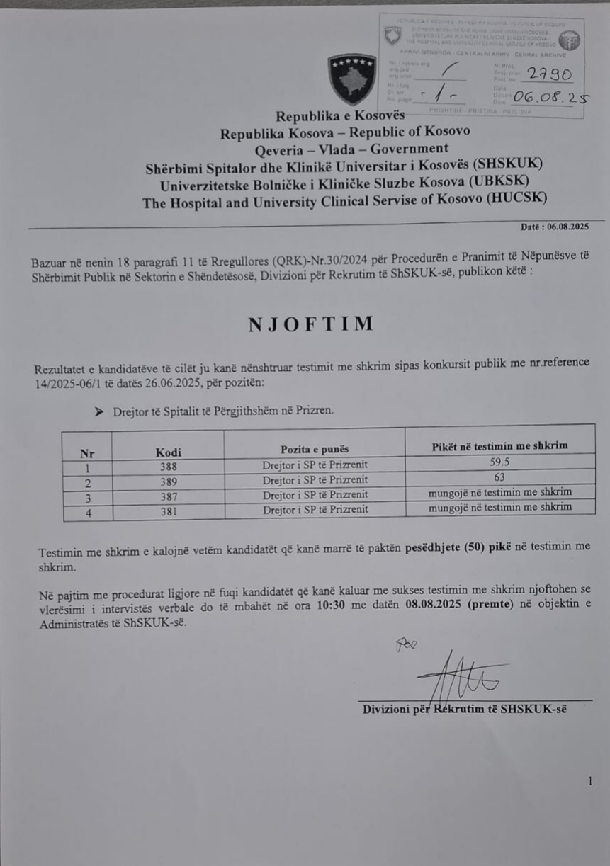 Rezultatet e testit me shkrim për drejtor të Spitalit të Prizrenit