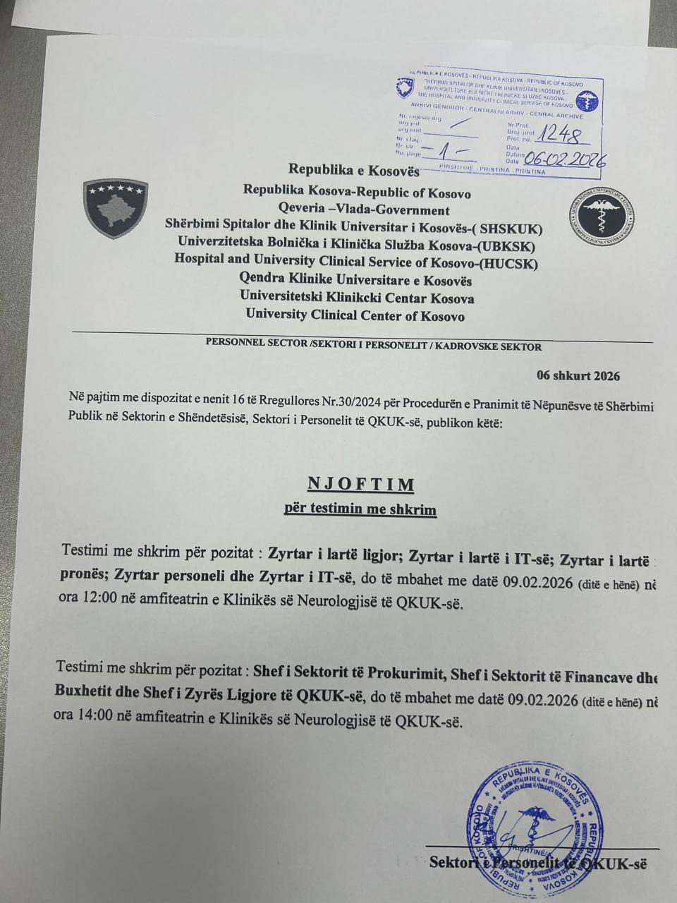 Njoftim për testim me shkrim