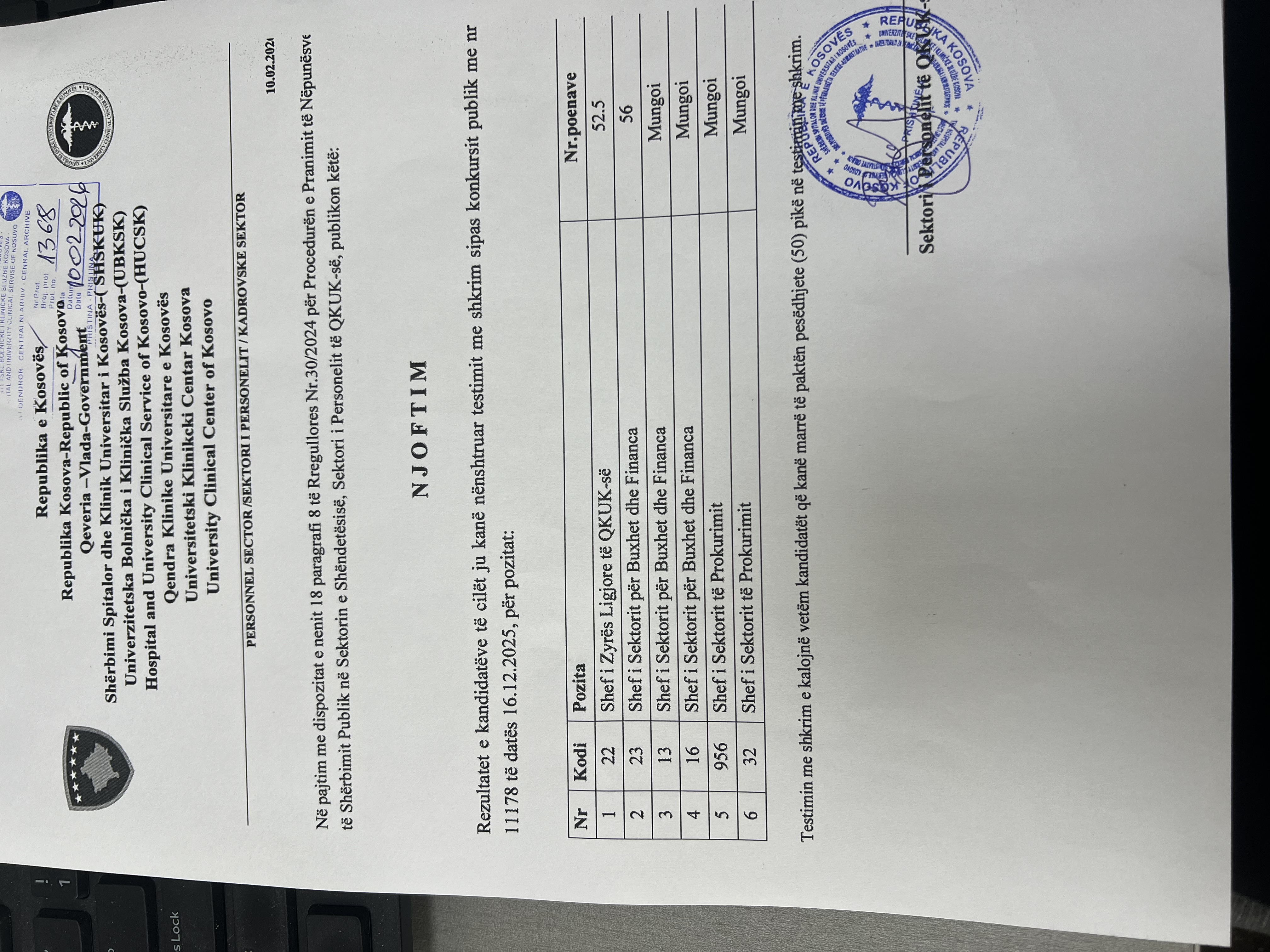 Njoftim per publikim te rezultateve te testit me shkrim per Konkursin nr 11178 dat; 16.12.2025